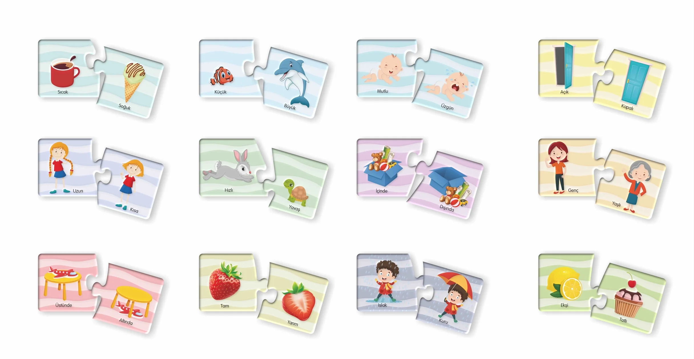 1,5 yaş ve üzeri çocuklar için tasarlanmış bu dayanıklı kart seti, eğlenceli bir şekilde zıt kavramları keşfetmelerini sağlarken motor becerilerini ve zihinsel gelişimlerini destekler.