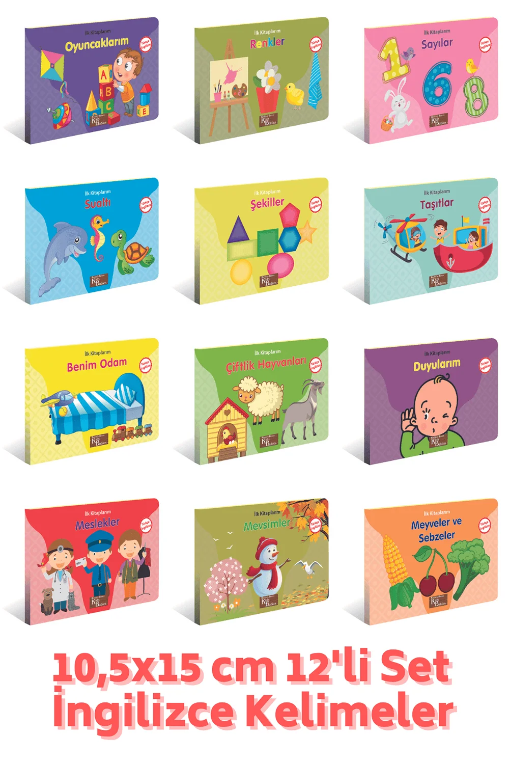 Bu 12 kitaplık set, çocukların temel İngilizce ve Türkçe kelimeleri öğrenmesini destekleyen, küçük eller için ideal boyutta ve kolay çevrilen sayfalara sahip bir kaynaktır.